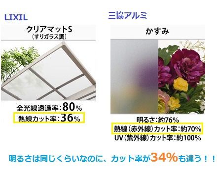 ↓左が三協アルミの普通のポリカーボネート、右が熱線遮断ポリカーボネートです。