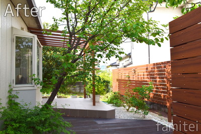 立派な草木に囲まれたお庭をもっと楽しみやすい空間へとリフォームをご希望でしたので、デザイン性の高いサザンテラスのパーゴラタイプでお庭にアクセントをプラス。温もり感溢れるご自慢のガーデンが生まれました。緑豊かなお庭へ出ると自然と心が落ち着き、素敵な空間で贅沢な時間を過ごす事が出来る様になりました。と、お施工主様より嬉しいお声を頂いた作品となりました。