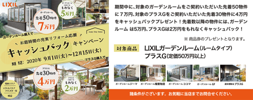 本日はガーデンルームをご購入いただくと応募できるキャッシュバックキャンペーンをご紹介いたします