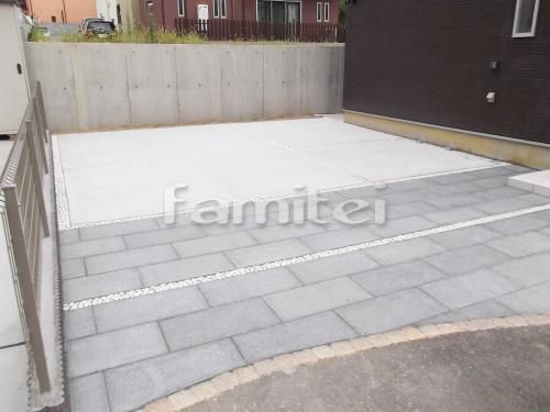 車庫土間 手前のグレー部分は板石・奥はコンクリート 目地は白い玉石です