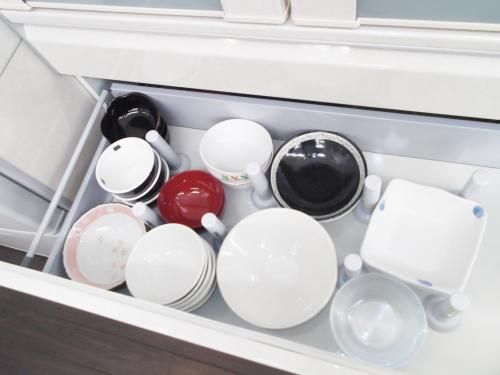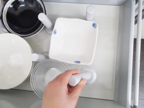 食器の間にポールで仕切ると、食器が動かないし、スッキリ整理できますよ♪