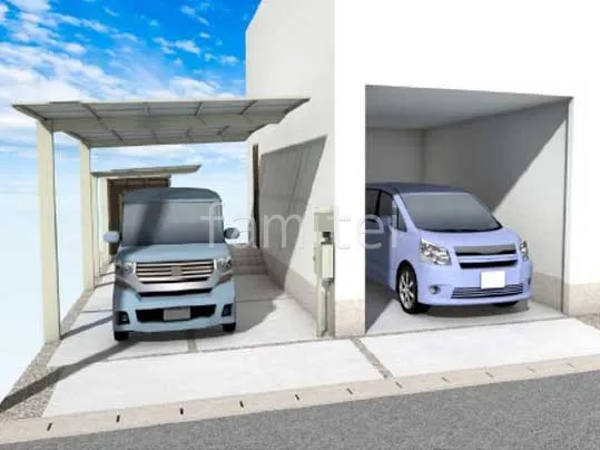 限られたスペースを有効活用するため、アクシィ2型の機能門柱を採用。インナーガレージとは別の駐車スペースには外観がすっきりとしたフラットタイプのカーポートのフーゴFを採用。柱高の異なるサイクルポートと合わせて設置することで雨に降られず安心です。エスモ物置ESE-1509Aを設置し、車や外回り用品も収納できます。