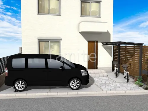 機能門柱はLIXIL ユーロブリーズを使用し、ヨーロピアンでかわいい外見と機能性を両立しています。玄関アプローチは白い乱形石を採用し、シンプルかつ華やかな仕上げに。サイクルポート LIXIL ネスカFを設置することで、自転車を雨風から守ります。