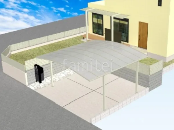 門まわりに宅配ボックス付き機能門柱 Panasonic アーキフレームFを設置し、シンプルなデザイン性と利便性を両立しました。 アプローチには白い乱形石を採用し、明るく上質な雰囲気を演出します。 駐車スペースには2台用カーポート LIXIL ネスカRを設け、車を雨風から守ります。 お庭には人工芝とウッドデッキ LIXIL 樹ら楽ステージを配置し、さらにスマートなデザインの1階用テラス屋根 LIXIL テラスSCを組み合わせることで、季節や天候に左右されずリラックスできるくつろぎの空間を作りました。