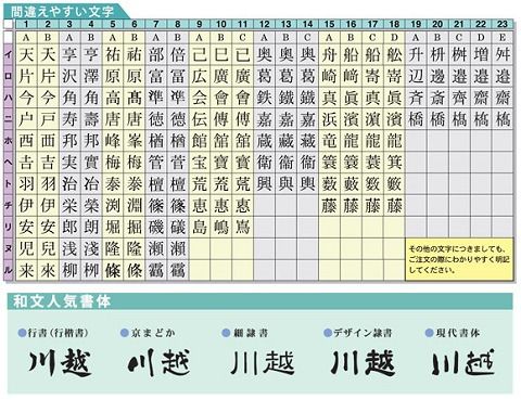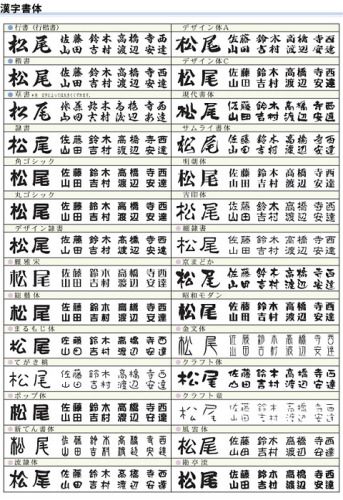 人気書体や間違えやすい文字につきましても、掲載をさせて頂いております