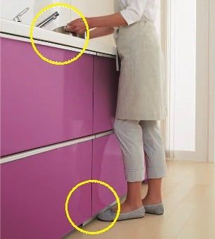 キャビネットのケコミ部分についた足元スイッチをつま先で軽く押すだけで