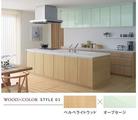 明るい木目と爽やかな青磁色の組合せ