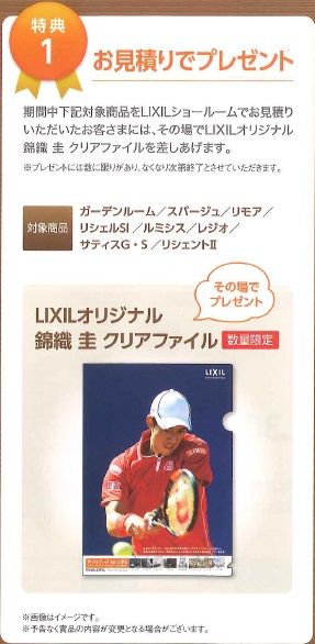 特典? 対象商品お見積りで錦織選手のクリアファイルプレゼント