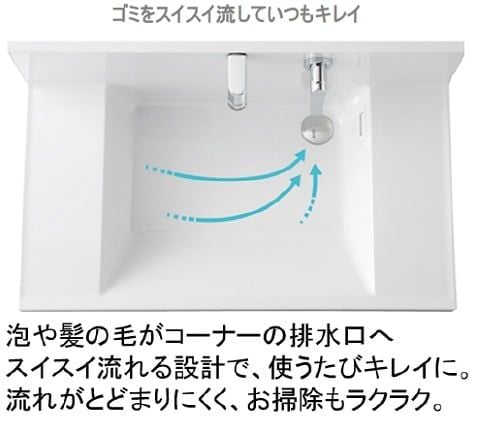 たとえば、洗面ボウルは水を流すだけで、髪の毛や泡を排水口へ押し流してくれる