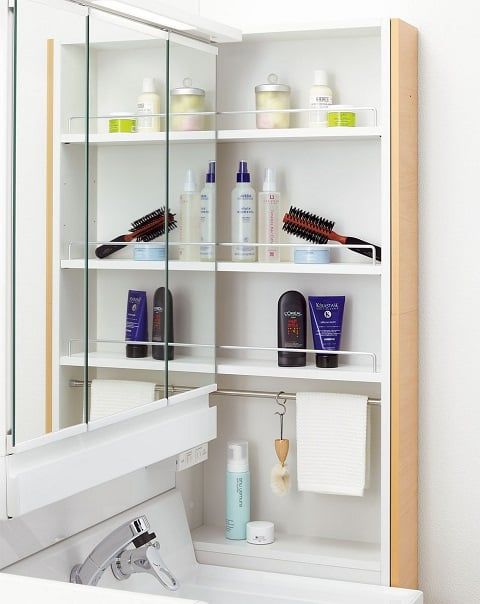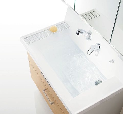 例えば、サイド収納が洗面台本体と一体にすることもできます。