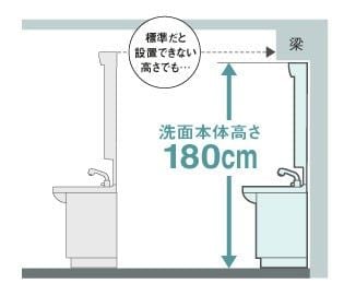 洗面台設置の際、上部に梁や収納がある場合は低天井対応(高さ180?)だと
