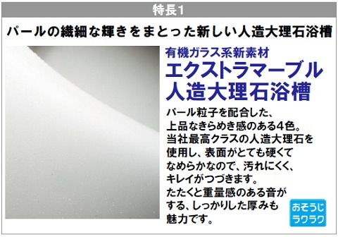 主役の浴槽には、肌さわりもなめらかな「エクストラマーブル人造大理石浴槽」。