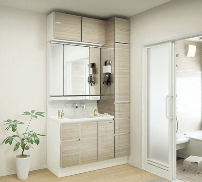 洗面周りの小物をくっつけて、機能的で便利な空間にできるんですよ