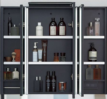 ミラー裏の収納スペースもブラックカラーになっており、(普通は白ですよね)