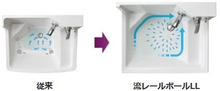 ボール全体に水が行き届いて、「流レール」に髪の毛や泡を集めて排水口へ導きます
