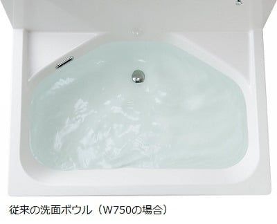 いままで幅75センチの洗面台だと、ボウルは大容量だったのですが、