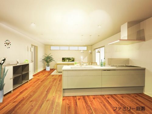 同じキッチンでも、しっかり木目のチェリー柄のフローリングにすると・・
