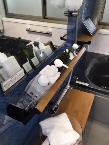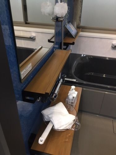 使い方としては、バスタブの前の棚には、ポータブルテレビやアロマキャンドルをおいてみたり。。