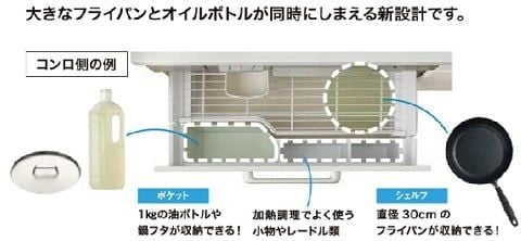 レードルなどの小物の収納に便利で直径30センチのフライパンが入るのは