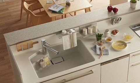 フラットな人造大理石一体形状でつなぎ目や段差をなくし、汚れがたまりにくいんです