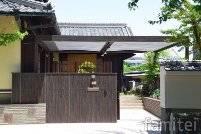 情緒溢れる“和”の雰囲気を大切にされた和風モダンな住宅の雰囲気を壊さないよう駐輪場の屋根を検討した結果、門壁と同系色のブラックエボニー色で「ホームヤードルーフカーヤードスタイル」をご提案致しました。重厚感あるデザインが、和の雰囲気とも調和し趣のあるエントランス空間となりました。ご家族様が大事にされている二輪車も、雨・風からしのげて機能性もご満足頂ける作品となりました。