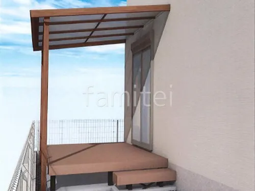 テラス屋根にLIXILシュエットを採用。フル木製調で柱も屋根枠も木製調カラーのナチュラルなテラス屋根です。その足元には人工木材ウッドデッキ LIXIL樹ら楽ステージを設置し、お庭に出やすくしました。テラス屋根にオプションの竿掛けを付けることで、洗濯物干しの空間にも活用できます。