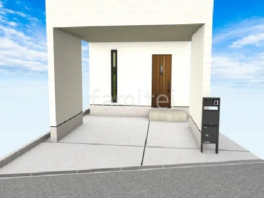 機能門柱はYKKAP ポスティモαIII D型。シンプルで使いやすい機能門柱です。玄関前は土間コンクリート敷きにすることで、駐車スペースとしても使うことが出来、無駄がありません。
