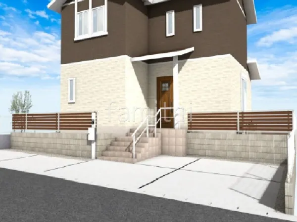 アプローチ兼駐車スペースには土間コンクリートを敷き、敷地を無駄なく有効活用できます。目隠しフェンスには、YKKAP 木製調ルシアスF04型を採用。木目のナチュラルな雰囲気が優しく、またフェンスに適度な隙間があることで防犯にもなり、プライバシーを守りつつ安全も担います。