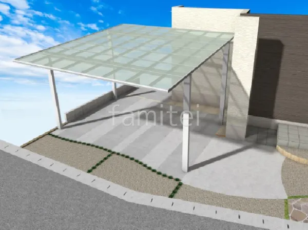 カーポートはYKKAP エフルージュFIRST横2台用を採用。フラットな屋根がスタイリッシュでカッコいいカーポートです。また、土間コンクリート敷きにすることで、使いやすく快適な駐車場スペースになりました。