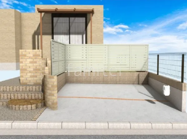 お庭の既存ウッドデッキやメッシュフェンスなどを解体撤去の後、新たに駐車スペースを施工しました。床に土間コンクリート 目地部分にレンガを施工しました。土留めに化粧ブロック ユニソン シャモティを施工。土留めブロック上に目隠しフェンス塀 LIXIL AB YS3型施工しました。既存のアプローチと違和感が出ないよう施工しました。