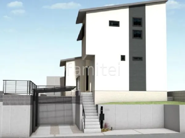玄関アプローチ階段横に機能門柱 照明なし三協アルミ エスポII 2型 パターンD を施工しました。 表札は機能門柱横の擁壁に取付し タカショー ガーデンアップライト で照らす用に配置しました。カーポートに LIXIL ネスカF を施工し、ガレージ床に轍(わだち)型の土間コンクリートを施工しました。アプローチ階段の途中まで 手摺(手すり)を施工しました。