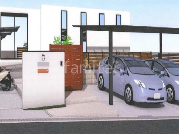 門柱は白の塗り壁仕上げ。美しく清潔感ある仕上がりです。駐車場スペースにはカーポート LIXIL ネスカF 横2台用を設置し、雨の日でも車の乗り降りが楽になります。土間コンクリート仕上げにすることで、車が乗り入れやすく、人も歩きやすくなっています。