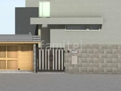 門まわり壁のタイルはタカショー セラレバンテ。大判のタイルで重厚感があります。宅配ボックス Panasonic コンボミドルを備え付けており、不在時でも配達物を受け取ることが出来ます。玄関門扉はLIXL 木製調プレミエスM-TA型 両開き。しっかりと玄関を守ります。駐車場スペースには、イナバ物置 ガレーディアを設置し、シャッターガレージで車を守ります。