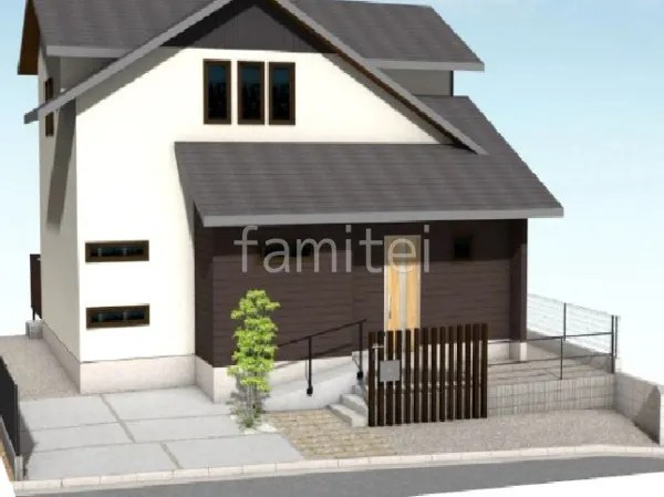 玄関アプローチに錆御影石を敷き、自然で和の雰囲気を醸し出しています。玄関前には木製調のデザインアルミ角柱を立て、格子風に仕上げ、おしゃれさが際立ちます。駐車場スペースには土間コンクリートを敷き、車が乗り入れしやすく、人が歩きやすく、快適です。