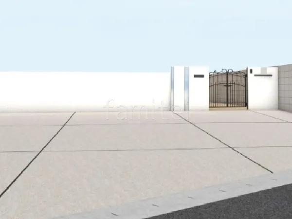 エスケー化研のベルアート塗装を使用した塗り壁門柱と塗り壁門袖が特徴的です。塗り壁は、耐久性と美観を兼ね備えたベルアート塗装を採用し、高級感あふれる外観を実現しています。また、門袖にはオンリーワン Gプレートガラス柱 を使用し、独特の風格を演出しています。門柱側にタカショーのレターバーライトを設置。夜間でも明るく、訪れる人々を暖かく迎え入れます。門袖側にYKKAPの郵便受けポスト エクステリアポストG3型を施工。機能性とデザイン性を兼ね備え日々の暮らしを豊かにします。