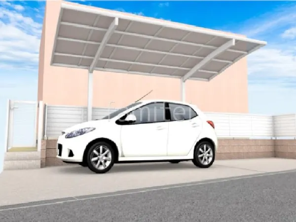 カーポートを取り付けるため、既存の境界フェンスやご自宅側に設置されていたウッドデッキとテラス屋根を撤去し、新たな土留め化粧ブロック ユニソンシャモティと境界フェンス LIXIL ABYL2型を施工し勝手口門扉 LIXIL AB YR2型 片開き を施工しました。また勝手口と駐車スペースとの段差があるため、モルタルステップを施工しました。カーポートにLIXIL ネスカRを施工しました。