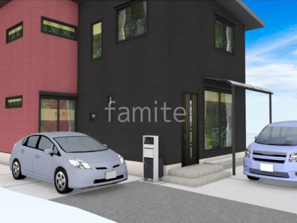 宅配ボックス門柱 パナソニックのアーキーフレームFが設置されています。宅配ボックスで不在時や対応出来ない際、宅配の受け取りが可能になり非常に便利です。境界にはタカショーのフェンス塀 トレメッシュシングルを使用しました。プライバシーを保ちつつ開放感があります。駐車場ガレージの床は土間コンクリートで施工。伸縮目地が施しひび割れを防ぎます。1階のテラスにはYKKAP 独立式レセパLタイプのテラス屋根があり、雨天でも快適に過ごすことができます。さらに、テラス屋根の下にモルタルステップが設けられており、掃き出し窓からお車への荷物の移動などにも使用できます。