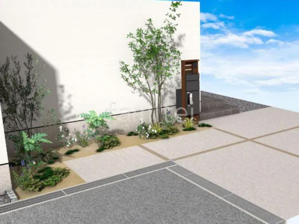 玄関アプローチ 駐車場ガレージ床 土間コンクリート 機能門柱 中庭 灯篭 延石 化粧砂利敷き お庭 化粧砂利敷き インターロッキング タイルデッキ 立水栓 シンボルツリー 低木 下草 苔