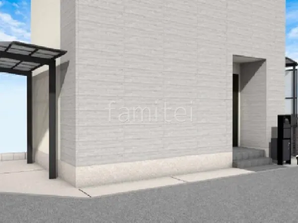機能門柱はPanasonic アーキフレームF。宅配ボックス機能付きで、不在時でも荷物を受け取る事が出来ます。駐車場スペースにはカーポート LIXIL フーゴFを設置。変形地への設置に対応した商品です。玄関横のスペースにはテラス屋根 LIXIL スピーネFを設置。雨除けとして多用途にお使いいただけます。