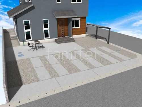 敷地の大部分を砂利敷きにし、駐車場スペースのタイヤ部分にだけ土間コンクリートを敷くことで、コストパフォーマンスよく、使い勝手の良い仕上がりです。サイクルポート LIXIL ネスカRを設置し、自転車の雨対策もばっちりです。