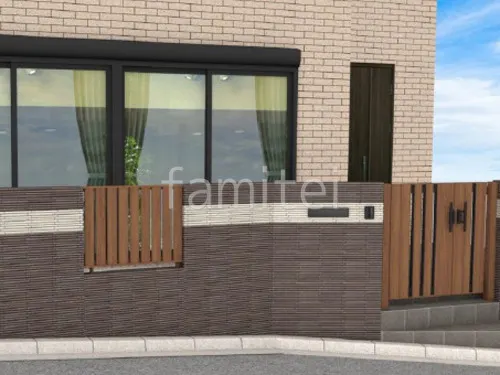 門塀にタイル LIXIL 細割ボーダーを採用し、ナチュラルで飽きのこない玄関になりました。タイルを2色使用することでアクセントを付けています。塀の一部に目隠しフェンス LIXIL 木製調AA TS1型を付けることで、適度に敷地内が見える様にし、万が一侵入されても外から見えるよう防犯対策としています。