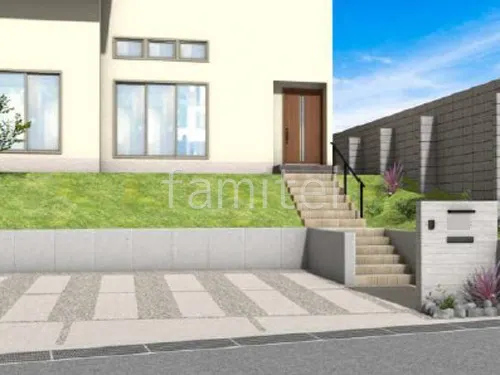 門柱に使用したタイルは、タカショー セラウォール。RC杉板調の大判タイルで、都会的な雰囲気を醸し出します。足元にはロックガーデン 栗石を敷き、自然な印象に。玄関アプローチ階段は化粧ブロック ユニソン リゲルで造作。法面には天然芝 姫高麗芝を敷いています。