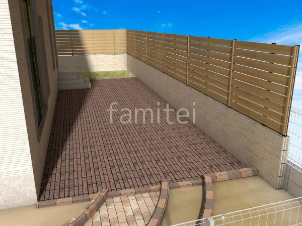 お庭の境界部分に目隠しフェンス F&F マイティウッドデコIIと化粧ブロック ユニソン ジャスティを設置しました。適度に視線を遮ることでお庭のプライバシーを守ります。家側のブロック部分には壁タイル ユニソン パレルモを貼り、優しい雰囲気を創っています。
