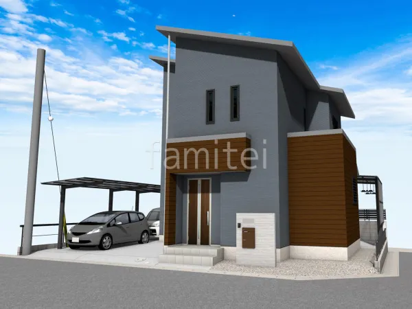 駐車場スペースにはカーポート LIXIL ネスカF 縦2台用を設置。フラット屋根のスタイリッシュな屋根で車を雨風から守ります。テラス屋根 LIXIL 独立式フーゴFテラスを取り付けることで、物干し場が増え、目隠しパネルも設置することでプライバシーも保たれます。家の躯体に打ち付けしない独立式ですので、家の保障面でも安心です。