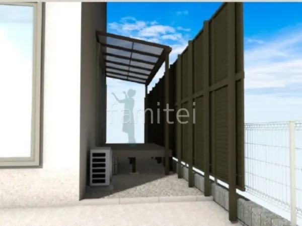 掃き出し窓の部分にウッドデッキ LIXIL 樹ら楽ステージと1Fテラス屋根 YKKAP ソラリアFを新設することにより、屋外スペースを快適に利用できるようになりました。 また敷地の境界に目隠しフェンス LIXIL AB YL3型 2段柱を設置し、プライバシーを確保。 テラス屋根にはオプションで竿掛けを取り付けて、周囲からの目線を気にせずに洗濯物を干すこともできます。
