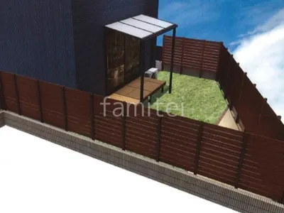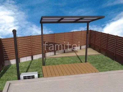 お庭周りを目隠しフェンス F&F マイティウッドデコllで囲み、プライバシーを確保しつつ木調の温かみのあるデザインでお庭空間を華やかにしました。 更に、既存のウッドデッキに1Fテラス屋根 YKKAP ソラリアFを設置することで、雨の日でも快適にアウトドア空間を過ごせるスペースになりました。