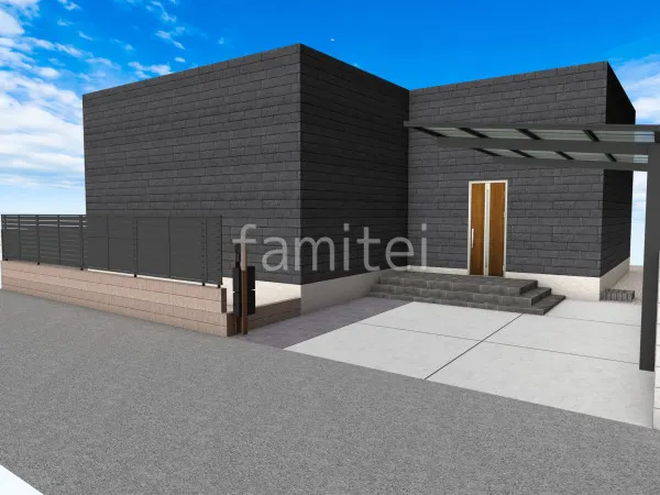 機能門柱にはLIXIL 木製調 アクシィ2型 宅配ボックス付きを採用。細身の機能門柱ですので場所を選ばずに取り付けができます。玄関アプローチはタイル LIXIL パセオを張り、シンプルながらも高級感のあるアプローチに。道路境界には目隠しフェンス LIXIL AB YS3型と化粧ブロック ユニソン シャモティを設置。隙間のあるタイプのフェンスが適度に視線を遮ります。駐車場スぺースにはカーポート YKKAP エフルージュFIRSTを設置し、雨の日でも焦らず車の乗り降りができます。
