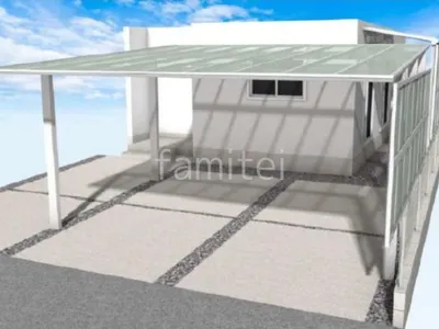 駐車スペースに2台用カーポート YKKAP エフルージュを設置し、オプションで側面パネルを追加することで風雨から車をしっかりと保護します。 また、建物横には前面パネル付きのテラス屋根 YKKAP ソラリアFを設置することで、プライバシーを保護しつつ、雨の日でも安心して洗濯物を干すことができます。