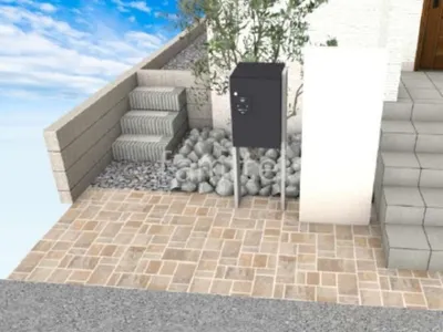 エントランスの植栽スペースに生えていた雑草を撤去し、防草シートと砂利を敷いて雑草対策を施しました。 また、自然石を使用したロックガーデンを配置することで、モダンな景観に仕上げました。 加えて、犬走へのスムーズな動線を確保するため、化粧ブロック階段を新設しました。