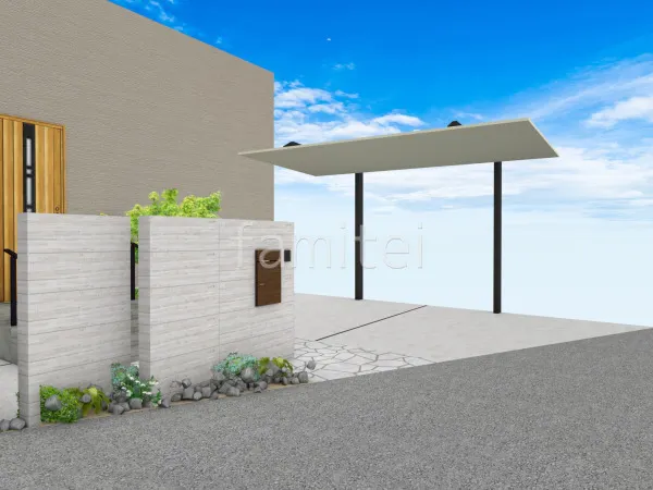 門柱に使用したタイルはタカショー セラウォール。RC杉板調の大判タイルで門まわりを落ち着いた雰囲気に。ロックガーデンやイロハモミジ、アプローチの白い乱形石も合わさり、和の雰囲気が漂います。駐車場スペースにはLIXIL カーポートSC 1台用を設置し、雨や紫外線から大切な車をしっかり守ります。
